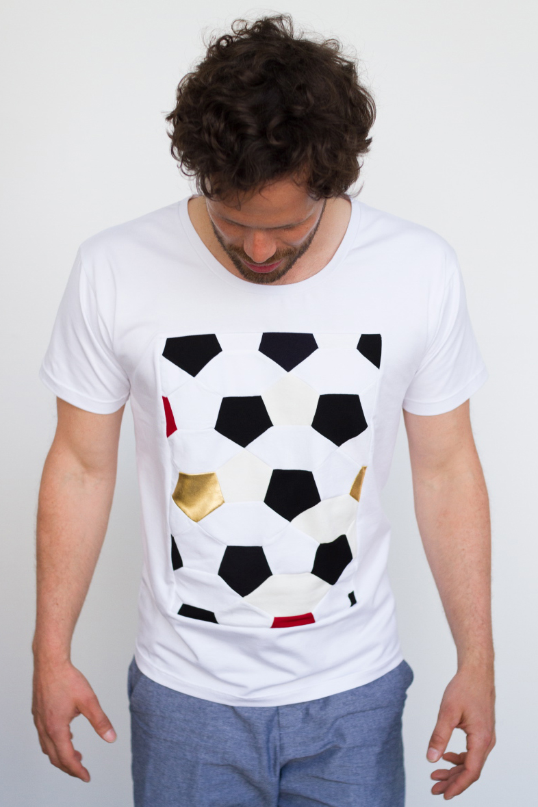 Aus der Kombination eines klassischen Schnitts mit einer traditionellen Handarbeitstechnik wird ein T-Shirt, welches die lokale Produktion fördert und gleichzeitig den Fußball bejubelt.