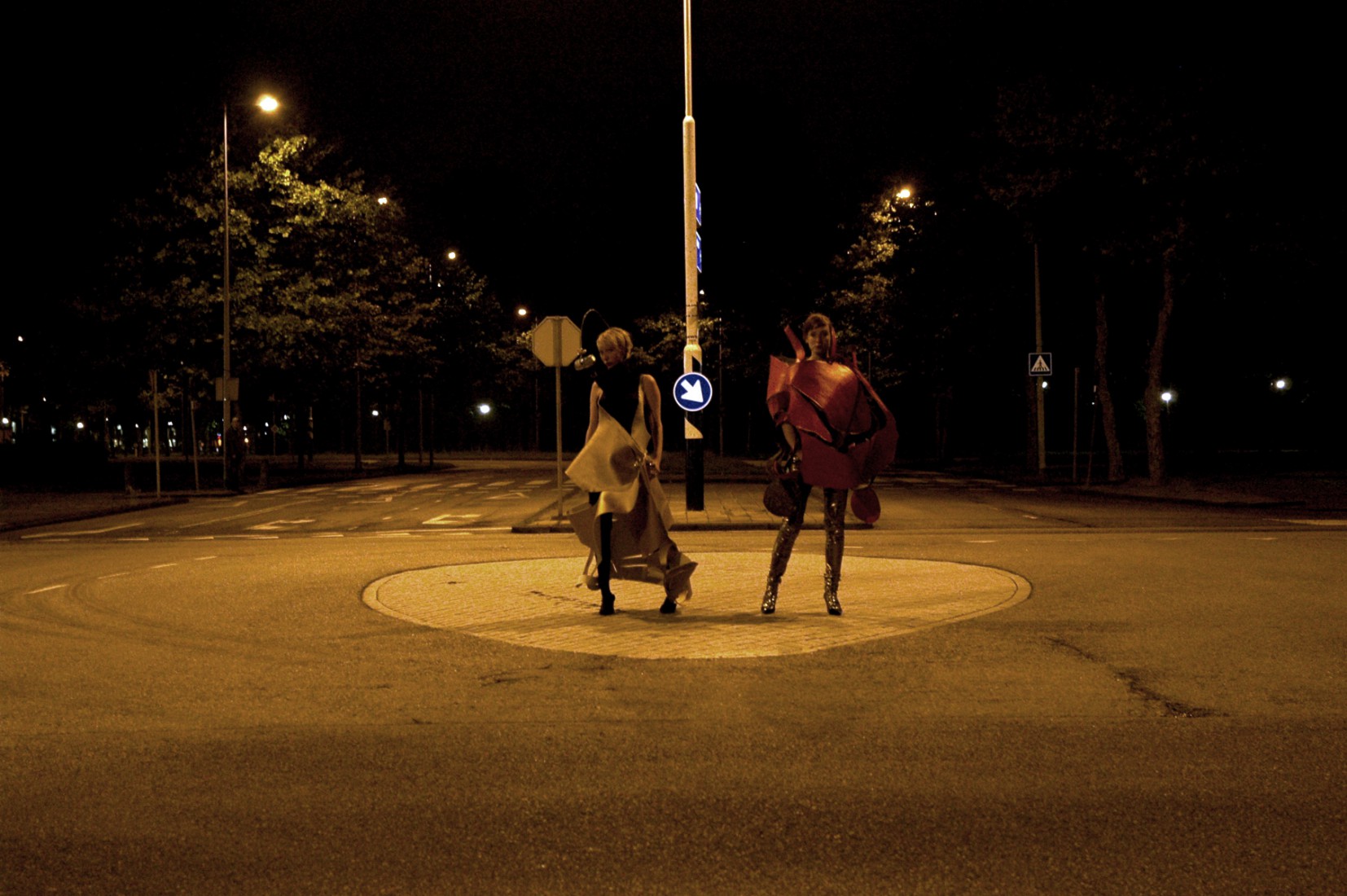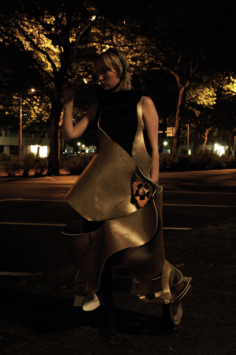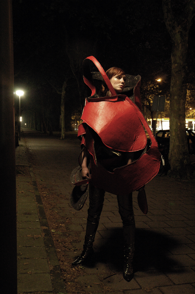 Two outfits created for AutoRai in Amsterdam, an annual exhibition with the latest cars. The shapes are a result of cutting out the silhouette of a car and draping it around the body. Made of vilt, pleather, screws, review mirror and metal pieces.