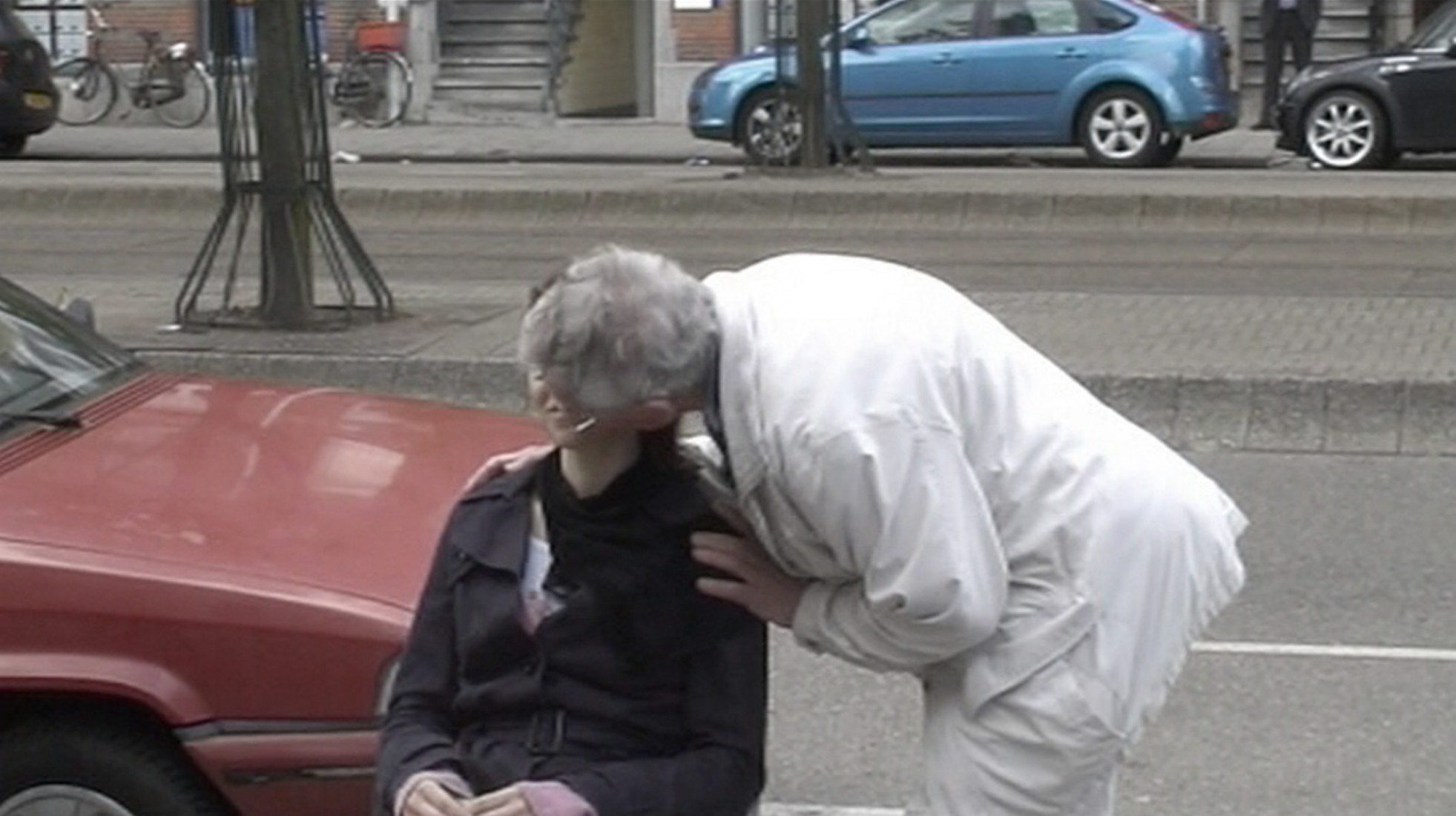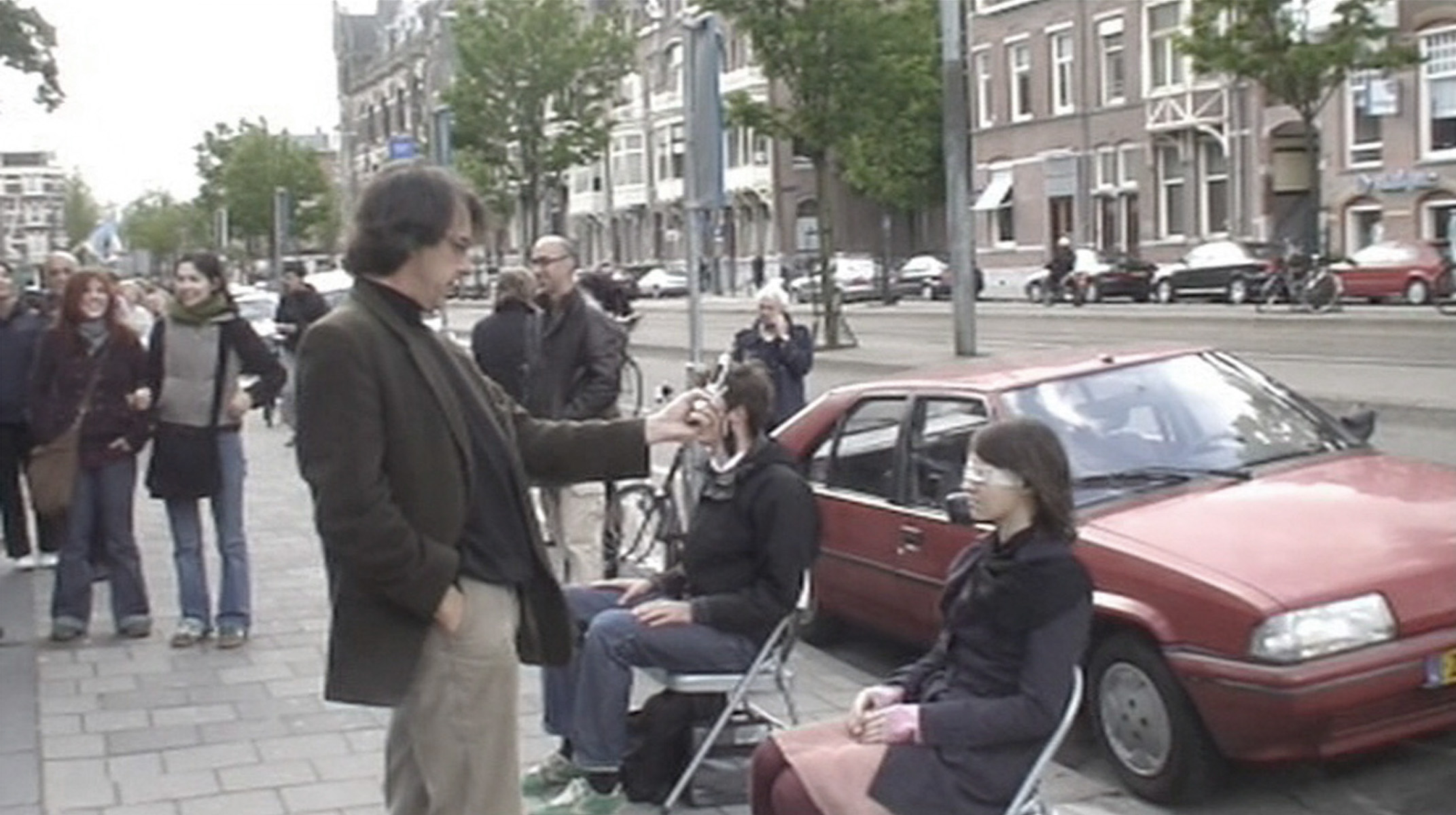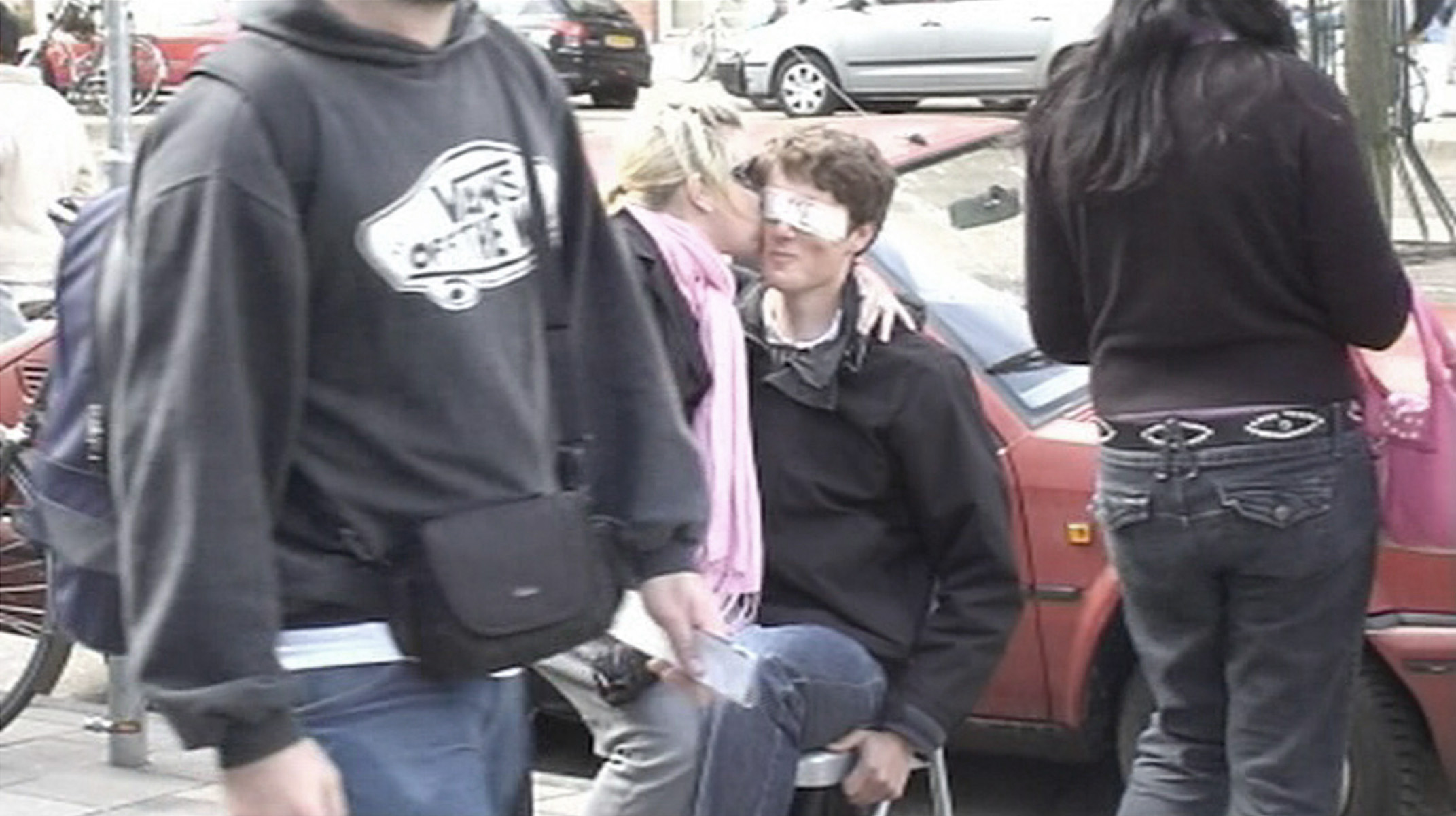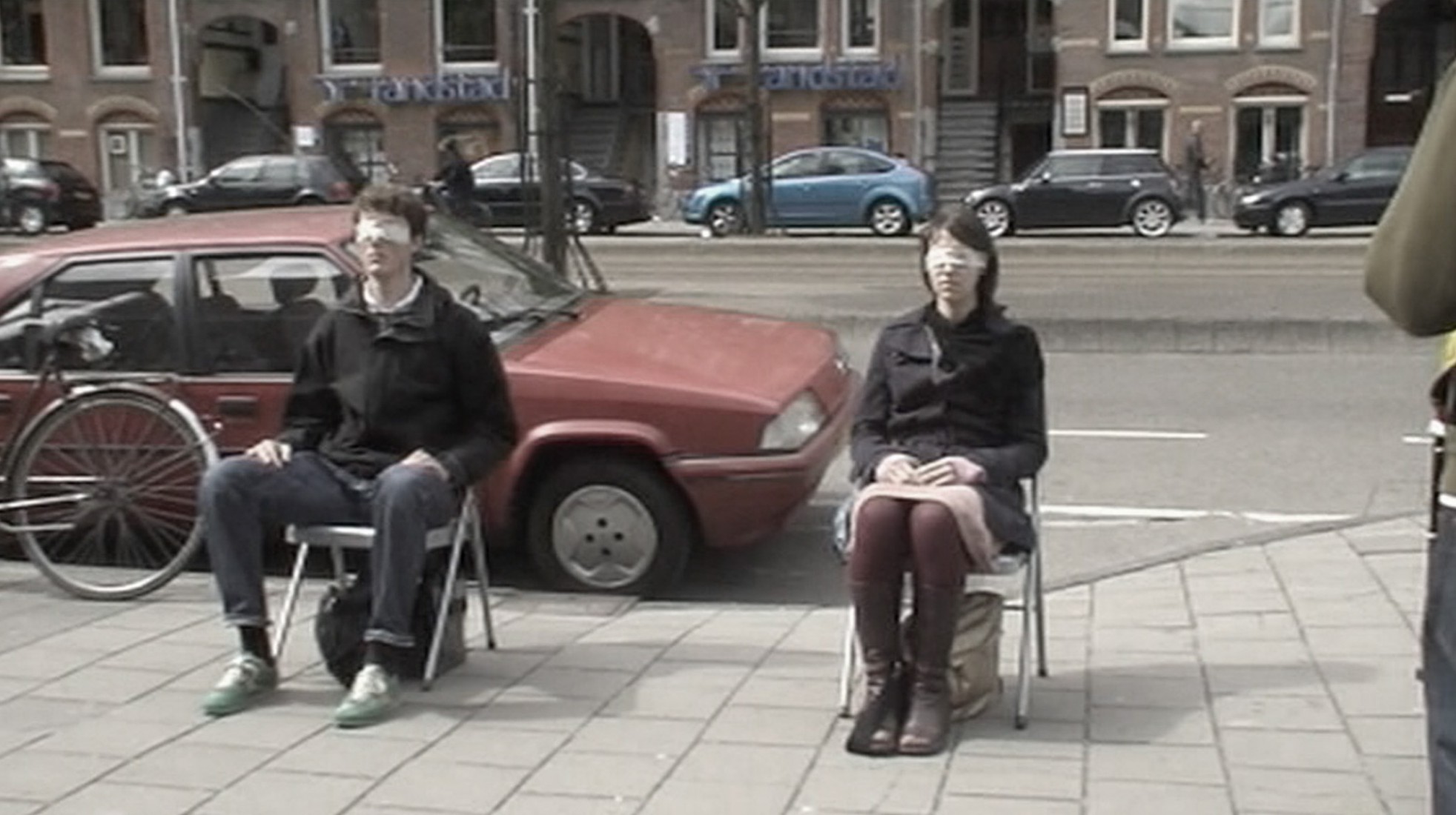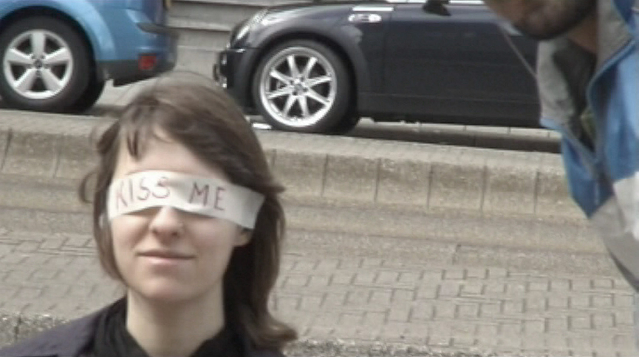 We sat at the Museumsplein in Amsterdam with a blindfold saying „Kiss me“. The idea was to create an intimate situation in a public space. The audience’s reaction was mainly the taking of photographs. Not many people had the courage to kiss us on the cheek.