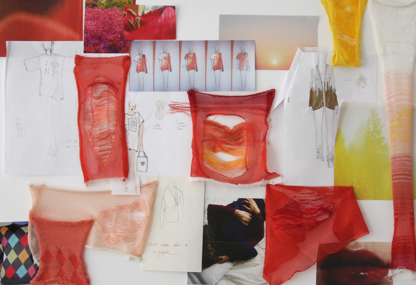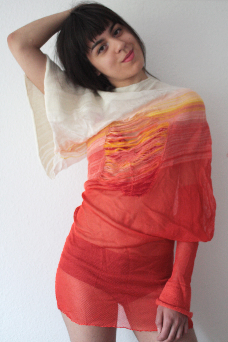 Garment is knitted in bialscut with a mix of wool and viscose yarn. The shape of a t-shirt and a sweater are melting together.